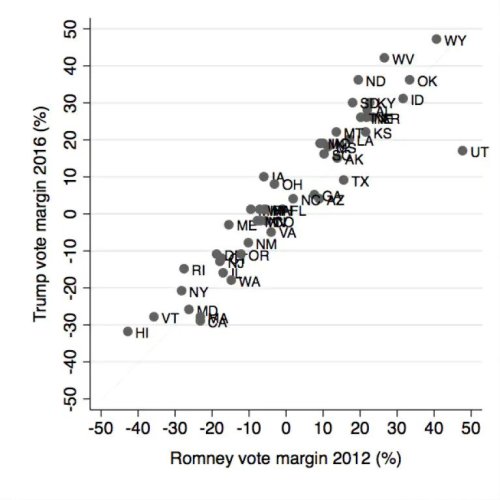 전체 득표율 말고 주별 개표 결과를 보더라도 지난번 선거와 크게 다르지 않은 패턴이 나타났다. 2012년 공화당 롬니 후보의 득표율과 2016년 트럼프 대통령의 득표율 사이의 상관관계는 0.93으로 매우 높게 나타난다.