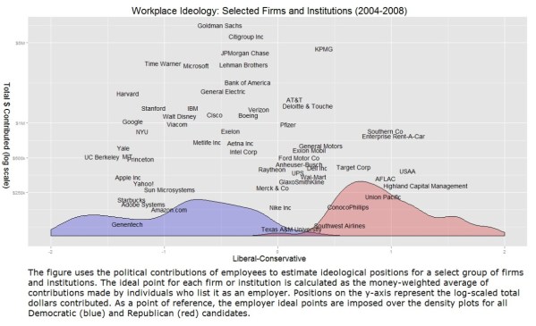 아담 보니카 교수의 논문도 몇 편 소개해 드렸죠. 그 가운데 200달러 이상 정치후원금을 낸 사람들의 직장 데이터를 모아 각 회사, 정확히는 그 회사에서 일하는 임직원들의 정치적 성향을 나타낸 그래프입니다. 출처는 보니카 교수가 운영하는 블로그입니다.