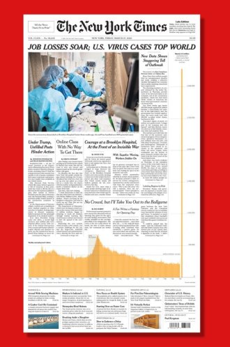 중간에 급증한 실업수당 신청 건수 이야기를 했는데, 뉴욕타임스는 종이신문 1면에 아래와 같이 극적으로 그래프를 실었습니다.