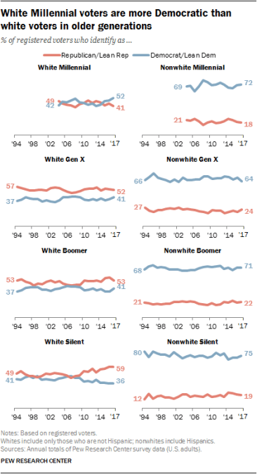 세대를 불문하고 백인을 제외한 유색인종은 민주당을 지지하는 성향이 뚜렷하고, 백인들은 민주당과 공화당에 대한 지지가 엇비슷합니다. 그러나 젊은 세대로 갈수록 백인들 사이에서도 민주당에 대한 지지가 좀 더 높게 나타납니다.
