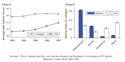베를루스코니 전 이탈리아 총리가 소유한 미디어 그룹인 미디어셋(Mediaset)이 공영방송 RAI와 얼마나 다른 편성 전략으로 시청자를 공략했는지 보여주는 그래프입니다.
