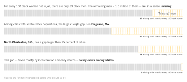 구조적인 인종차별이 복합적으로 작용한 명백한 결과 가운데 하나가 특히 흑인 남성에서 압도적으로 높게 나타나는 투옥률(incarceration rate)입니다. 뉴욕타임스가 2015년 4월 업샷에 쓴 기사를 보면, 감옥에 있는 25~54세 흑인 남성이 너무 많아서 해당 연령대의 미국 흑인 성비가 100:83밖에 되지 않습니다. 감옥에 있거나 강력범죄로 사망해 말그대로 우리 곁에서 사라진(missing) 흑인 남성이 150만 명에 이른다고 뉴욕타임스는 썼습니다. (뉴스페퍼민트 해당 기사 요약)
